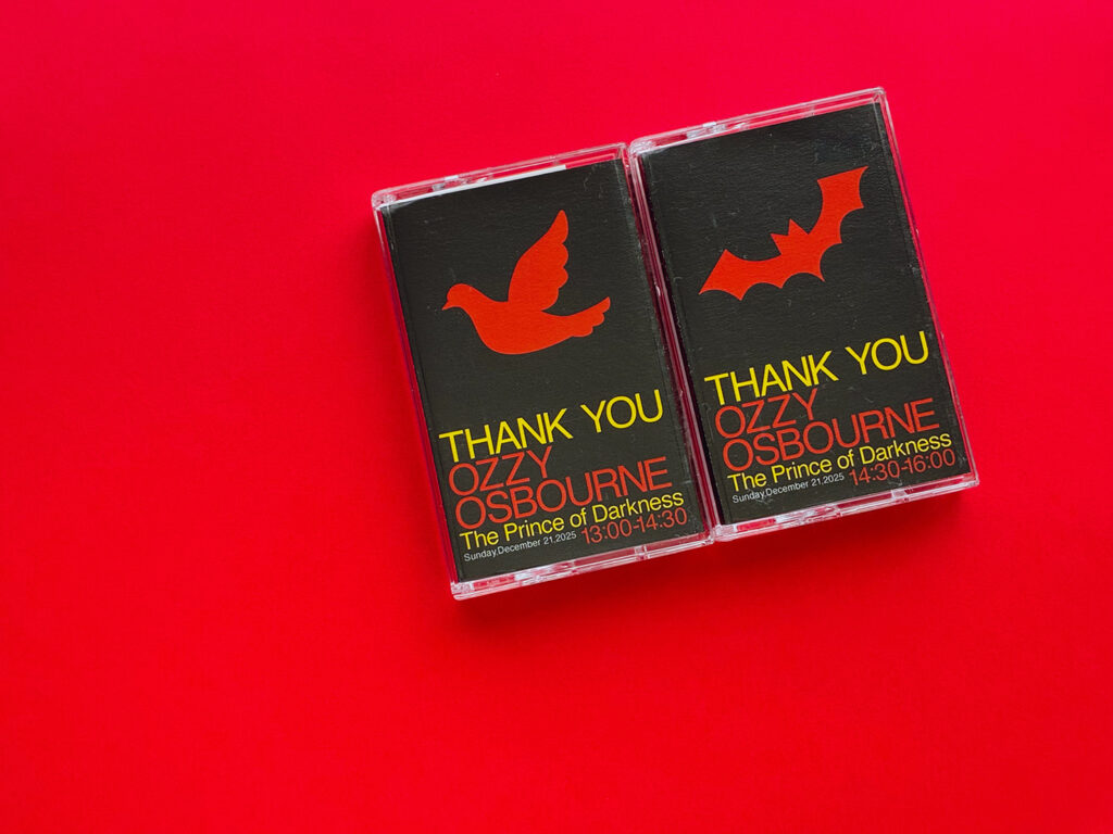 オジーのステージなどでのエピソードに関する生き物をイラスト化し、オジー・オズボーンのロゴカラーを用いて、欧文フォントで構成。どうしても背景は黒になってしまうなあ。