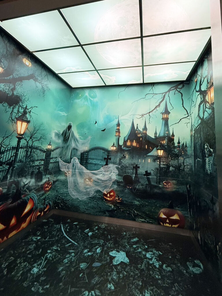 図柄は怖いですが、明るい配色にし、天井も明るめにしてできるだけ不快感の無い雰囲気に仕上げました。