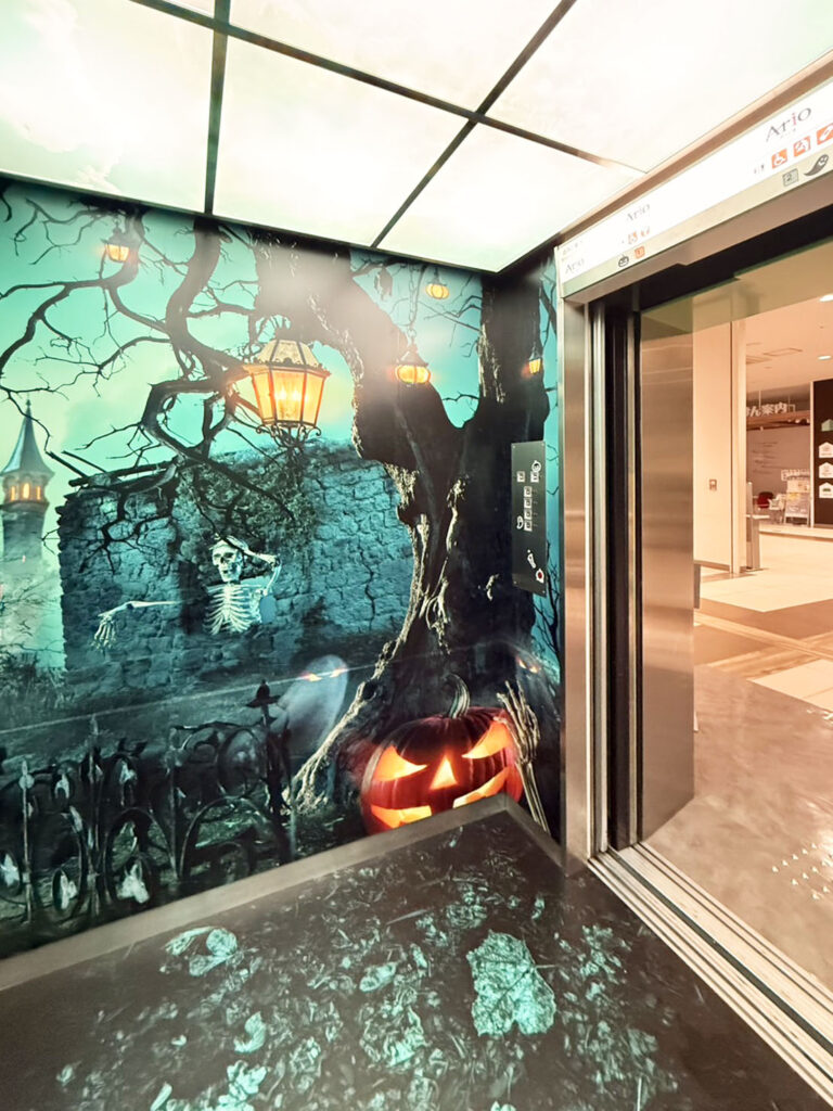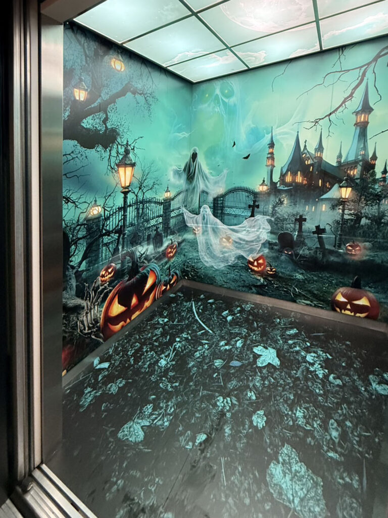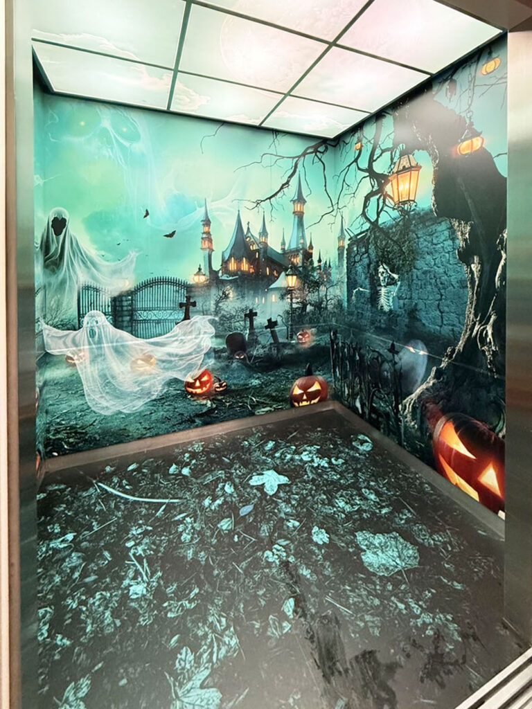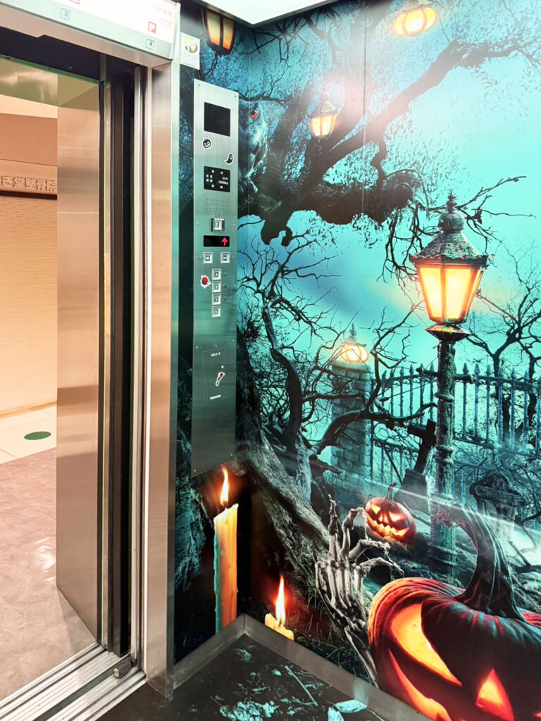 エレベーターはイレギュラーな部分が多く、貼る職人も大変苦労していましたが、